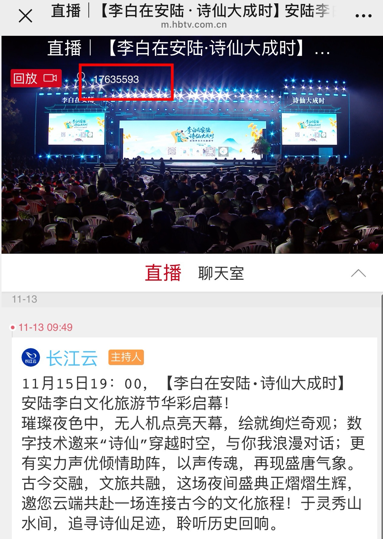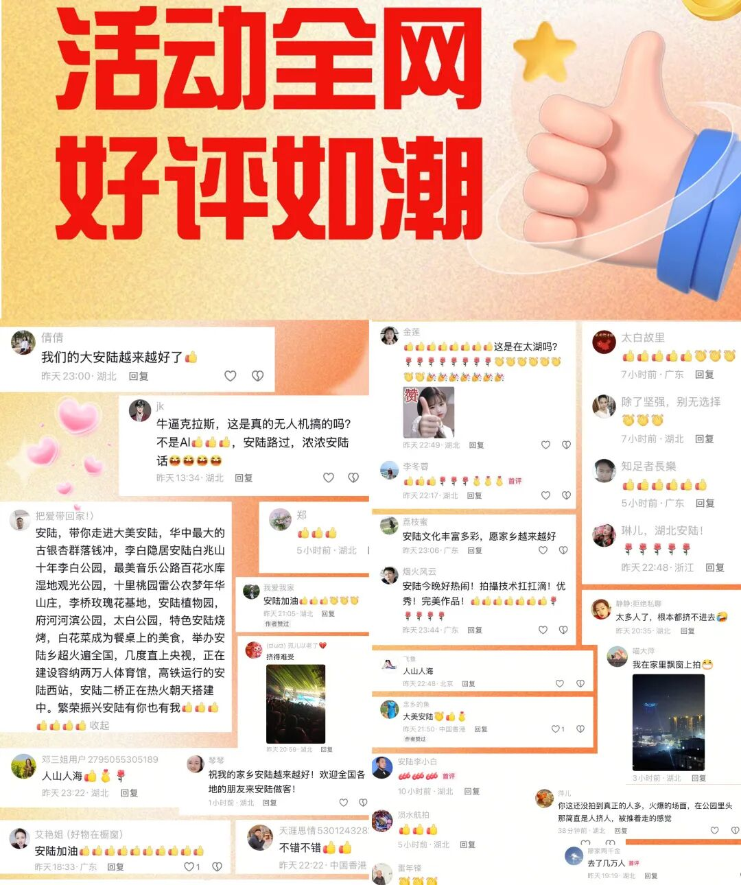 线上网友也纷纷留言表示“今晚的安陆太热闹!挤着看完全程,每一幕都精彩到舍不得眨眼”“为家乡的文化盛宴骄傲,安陆这波太有排面”;外地安陆老乡隔空感慨“隔着屏幕都被氛围感染,这波文旅盛宴太圈粉”“诗仙文化+科技呈现,看得心驰神往”。