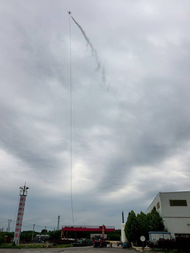 检测现场,ZTX260系留无人机系统以严苛标准通过实飞检验,成功挑战了高层灭火的极限:ZTX260升至150米高度后持续喷射泡沫灭火剂,系留供电总功率稳定控制在50kW以内,动力系统平均油门保持在60%以下,全程姿态平稳运行1小时,成为国内首个完成这一指标的装备。这一成就填补了国内高空连续灭火的技术空白,为超高层建筑消防提供了突破性解决方案。